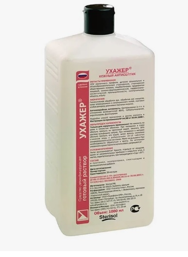 - обработка рук хирургов – перед применением средства кисти рук и предплечья предварительно тщательно моют, не менее чем двукратно, теплой проточной водой и мылом (например, жидким мылом «Ухажер»®) в течение 2 минут, высушивают стерильной марлевой салфеткой. Затем на кисти рук наносят дважды по 5 мл средства и втирают в кожу кистей рук и предплечий, поддерживая их во влажном состоянии. Общее время обработки составляет 5 мин. Стерильные перчатки надевают после полного высыхания средства.