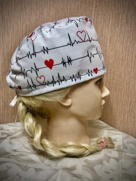 Шапочка медицинского работника, с принтом, округлой формы, размер регулируется завязками, высота по передней стенки 11 см.