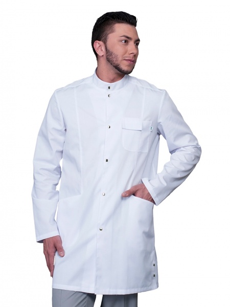 Качественный белый мужской медицинский халат с длинным рукавом и элегантным воротником-стойкой. Медицинский халат производства фирмы Медис с двумя большими, вместительными карманами по бокам и одним небольшим нагрудным. Рукав длинный. Удобная застежка на кнопках из нержавеющей стали, производства Греция. Ткань практичная, средней плотности, устойчива к истиранию и не выгорает. Отличный халат врача.
