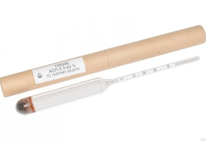 Ареометр АСП-3 (0-40) представляет собой запаянный поплавок из тонкого стекла, в который помещен утяжелитель определенной массы. Для проведения замера нужно осторожно поместить его в раствор, не допуская контакта со стенками емкости. Плотность определяется в зависимости от того, какой объем жидкости будет вытеснен: для считывания показателя в верхней узкой части расположена шкала с делениями.