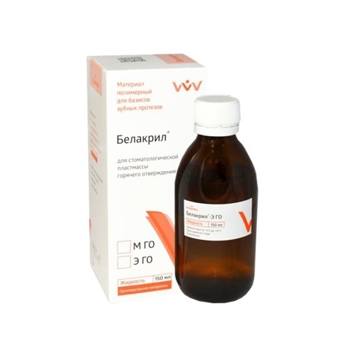 Базисные материалы «Белакрил» выпускаются в виде двух компонентов - порошка, содержащего полиэфиры метакриловой кислоты, катализатор реакции полимеризации перекись бензоила, и жидкости, содержащей мономер метилметакрилат (М) и/или мономер этилметакрилат (Э), после смешивания порошка с жидкостью образуется полимер, твердеющий при нагревании (горячего отверждения) - ГО или без нагревания (самотвердеющий) - ХО. Базисные материалы «Белакрил» отличает высокая технологичность, простота и быстрота изготовления изделий, имеющих высокое качество, функциональную долговечность, натуральный внешний вид и биосовместимость.