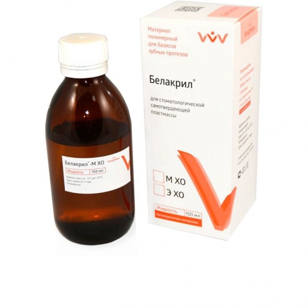 Базисные материалы «Белакрил» выпускаются в виде двух компонентов - порошка, содержащего полиэфиры метакриловой кислоты, катализатор реакции полимеризации перекись бензоила, и жидкости, содержащей мономер метилметакрилат (М) и/или мономер этилметакрилат (Э), после смешивания порошка с жидкостью образуется полимер, твердеющий при нагревании (горячего отверждения) - ГО или без нагревания (самотвердеющий) - ХО. Базисные материалы «Белакрил» отличает высокая технологичность, простота и быстрота изготовления изделий, имеющих высокое качество, функциональную долговечность, натуральный внешний вид и биосовместимость.
