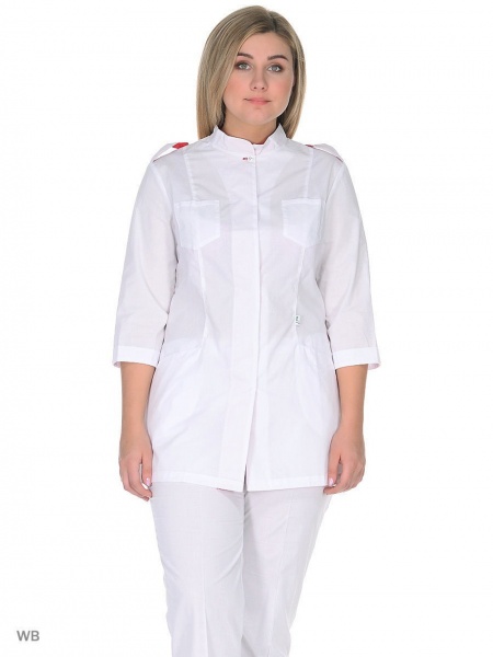 Женская медицинская блуза с рукавом ¾. Оригинальность модели придают цветные детали нижнего воротника, нижних частей погон, подборт потайной застежки, и цветные петли. Застежка потайная с одной верхней пуговицей и цветной петлей. По спинке между рельефами кулиска на эластичной ленте.