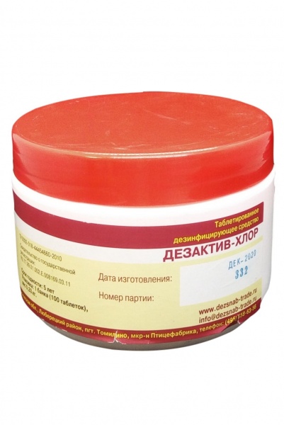- натриевая соль дихлоризоциануровой кислоты - 84,0%, вспомогательные компоненты. При растворении 1 таблетки в воде выделяется 1,52 ± 0,12 г активного хлора (АХ).