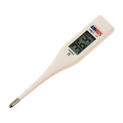Протрите электронный градусник Amrus Enterprise AMDT 14 спиртовой салфеткой до использования. Встряхните. На экране отобразятся: