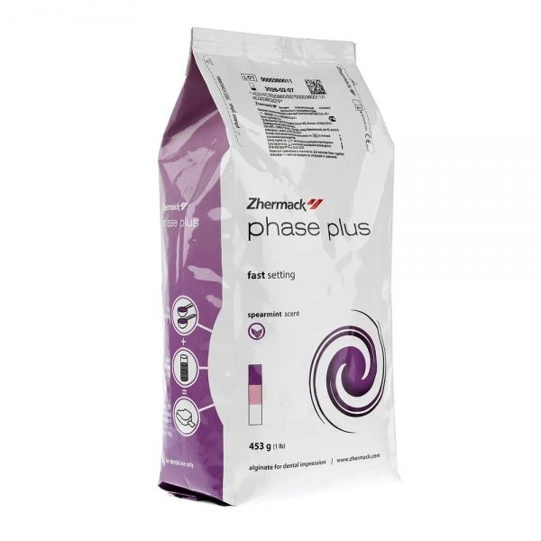 Характеристики: хроматический трехфазовый альгинат: фиолетовый (при смешивании), розовый (при обработке), белый (в ротовой полости); малое время обработки и быстрое схватывание; тиксотропный; аромат хлорофилла.