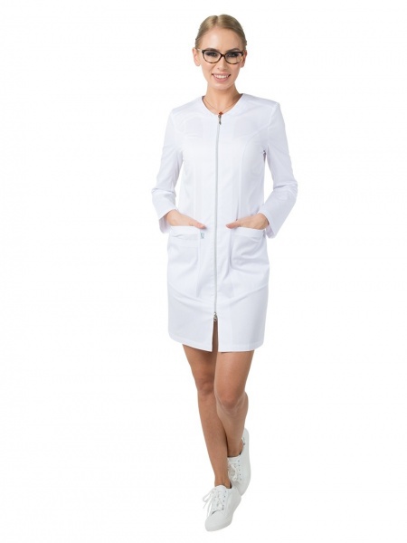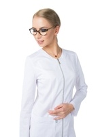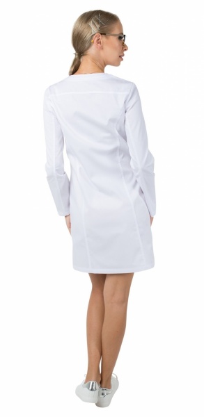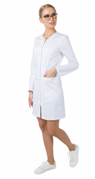 Белый медицинский халат слегка приталенного силуэта. Застежка-молния серебряного цвета. Длинный рукав. Изделие сделано из ткани, в состав которой входят полиэфирные волокна стойкие к стиранию, быстро восстанавливающие форму после смятия.