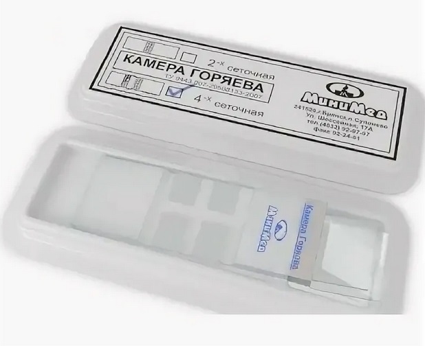 Камера для счета форменных элементов крови (Камера Горяева), 4-х сеточная предназначена для подсчета форменных элементов крови и иных частиц сходных размеров. Изготовлена из оптического стекла марки К-8. Сетка нанесена методом гравировки с максимальной контрастностью при микроскопии и отличной устойчивостью к механическим воздействия. Сетка состоит из 225 больших квадратов. В комплект входят 5 специально полированных покровных стёкол, обеспечивающих заданную точность объема камеры.
