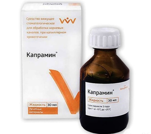 Капрамин разработан для прекращения кровотечений капиллярного типа. Жидкость содержит в себе хлористый алюминий и центимониум бромид, оказывающие кровеостанавливающий эффект, устраняющие инфекцию и обеззараживающие раны.