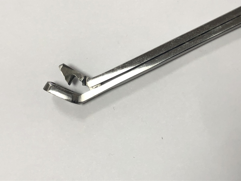 Конхотом с щелевидным отверстием №2 представляет собой щипцы пистолетного типа, при сжатии ручек которых происходит соединение рабочих частей инструмента. Рабочие части конхотома выполнены в виде ложек нижняя полая, а верхняя в форме ножа, которые захватывают и перекусывают необходимый участок тканей. Нижняя губка конхотома стабильна, верхняя подвижная и заострена.