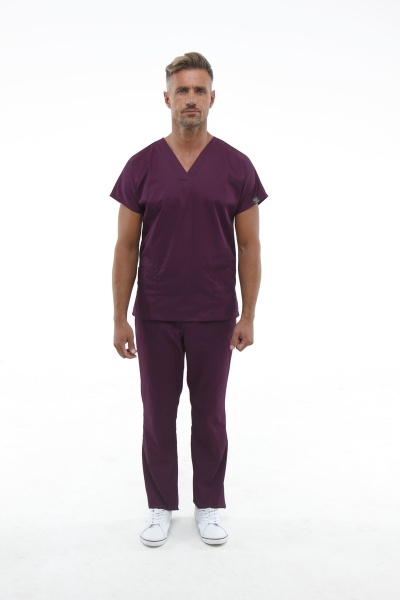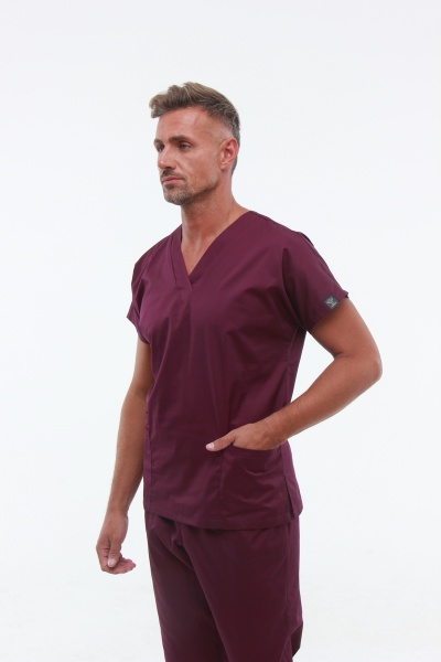 Костюм состоит из блузы и брюк. Мужская медицинская блуза темно-синего цвета с голубой отделкой, с двумя вместительными карманами. Куртка с удобным коротким рукавом. Брюки прямого покроя с двумя глубокими карманами. Прямой фасон костюма не сковывает движения. Для создания данной модели используется качественная ткань, относящаяся к категории малосминаемых, не истирающихся и не выгорающих.