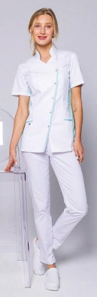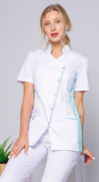 Блуза с воротником – стойкой, ассиметричной застёжкой и полуприлегающим силуэтом с бирюзовыми вставками.