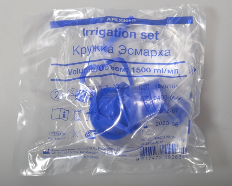 Медицинское приспособление в форме пакета, трубки и зажима. Одноразовая стерильная кружка Эсмарха Апексмед 1500 мл выполнена из полиэтилена. На закругленный конец трубки нанесена смазка, которая способствует атравматичному использованию. Плотная крышка помогает избежать протекания. При необходимости изделие можно подвесить за стойку за уплотнительное кольцо.