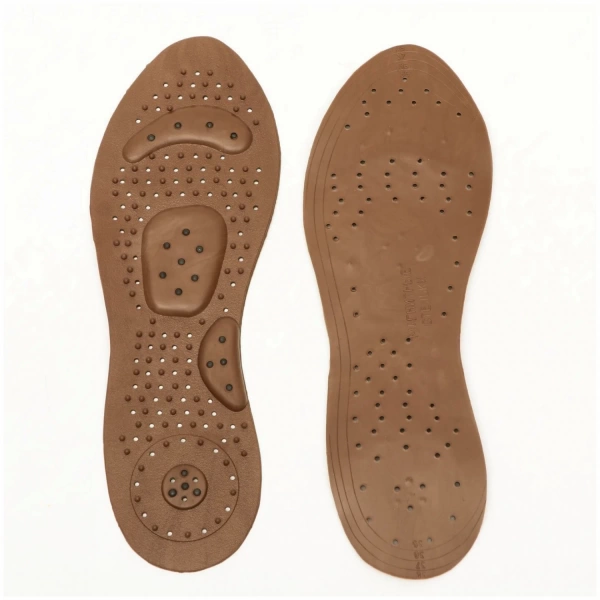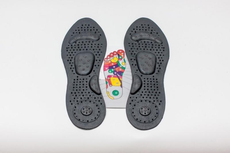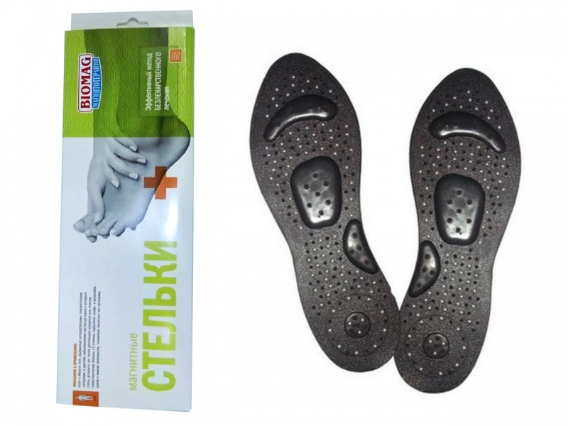 Стельки магнитные сделаны из гигиенического пластика, в основании которого встроены лечебные магнитные шарики. А небольшие эластичные шипы, выполняющие функции массажера, создают прослойку воздуха между стопой и стелькой. При этом достигается ряд полезных для вас эффектов; биологически активные точки стопы получают двойной массаж — магнитный и физиологический, и при этом открывается более полный приток воздуха к ноге.