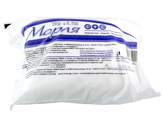Медицинская марля - хлопчатобумажная отбеленная ткань редкого полотняного переплетения. Медицинская отбеленная марля отличается прочностью на разрыв, высокой гигроскопичностью, мягкостью. Способы использования её разнообразны: марлю применяют в качестве перевязочного материала, как полуфабрикат для изготовления бинтов и салфеток, как впитывающий материал.