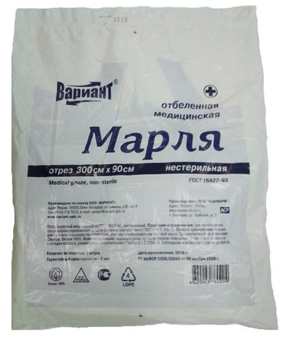 Медицинская марля - хлопчатобумажная отбеленная ткань редкого полотняного переплетения. Медицинская отбеленная марля отличается прочностью на разрыв, высокой гигроскопичностью, мягкостью. Способы использования её разнообразны: марлю применяют в качестве перевязочного материала, как полуфабрикат для изготовления бинтов и салфеток, как впитывающий материал.