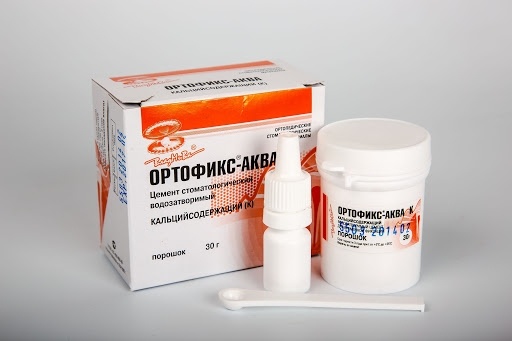- «Ортофикс-Аква» кальцийсодержащий представляет собой водозатворимый кальцийсодержащий цинксульфатный цемент, модифицированный добавками. Основными компонентами порошка являются: окись цинка, сульфат цинка и фосфаты кальция. При смешивании кальцийсодержащего порошка с дистиллированной водой образуется пластичная паста.
