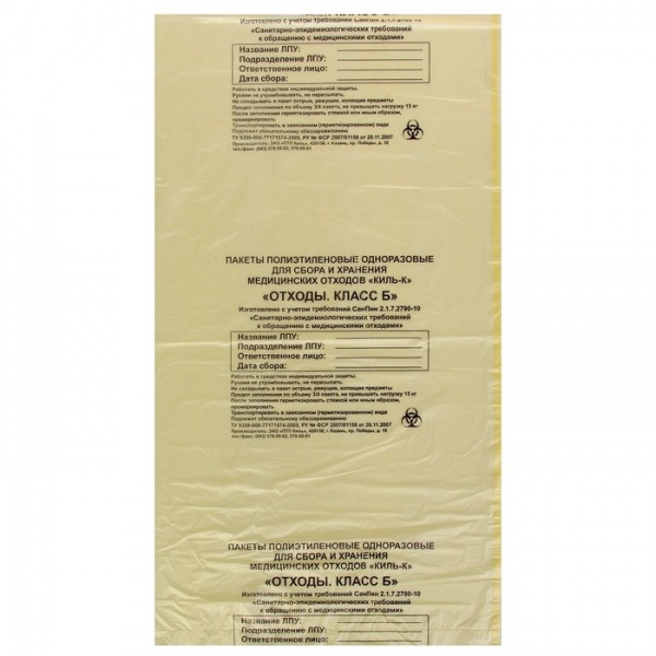 Пакет для медицинских отходов класс Б желтый. Пакет с толщиной стенки 10 мкм. Объем 60 литров, ширина 700 и длина 800 мм позволяют использовать в стандартных емкостях для сбора отходов. Наличие тиснения для увеличения нагрузки на пакет при упаковывании и перемещения отходов с острыми краями. На стенки пакета нанесена печать для заполнения информации, что позволяет обходиться без дополнительных бирок.