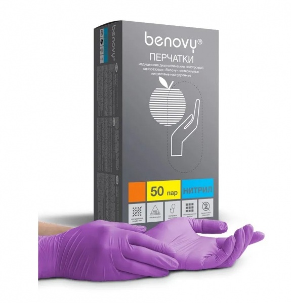 Одноразовые перчатки Benovy размера М выполнены из нитрила, благодаря чему обеспечивают полное облегание рук с сохранением тактильных ощущений. Гипоалергенны. Рабочая поверхность перчаток имеет выраженную текстуру, которая обеспечивает надежный захват и удержание инструментов в условиях повышенной влажности. Перчатки можно использовать при бытовых работах, обработке продуктов питания, также при косметологических процедурах. Перчатки поставляются в картонной упаковке. Количество в упаковке: 50 пар. Имеется регистрационное удостоверение на медицинское изделие.