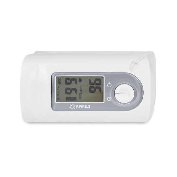 - Монохромный цифровой экран понятно и четко отображает все необходимые данные – частоту пульса, а также уровень насыщения крови кислородом (SpO2). Также на дисплее есть индикатор заряда батареи