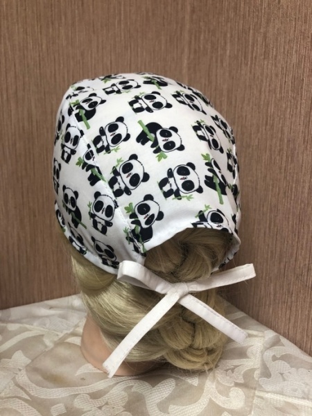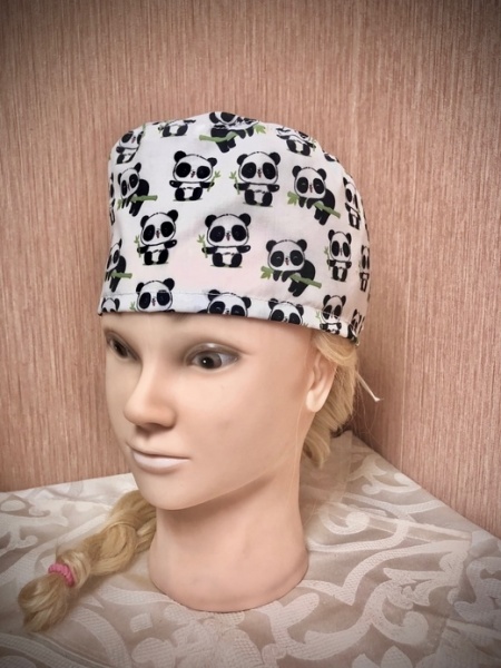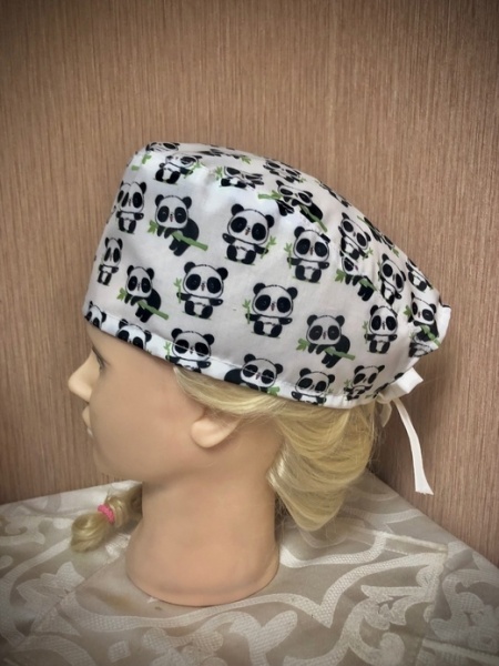Шапочка медицинского работника, с принтом, округлой формы, размер регулируется завязками, высота по передней стенки 11 см.