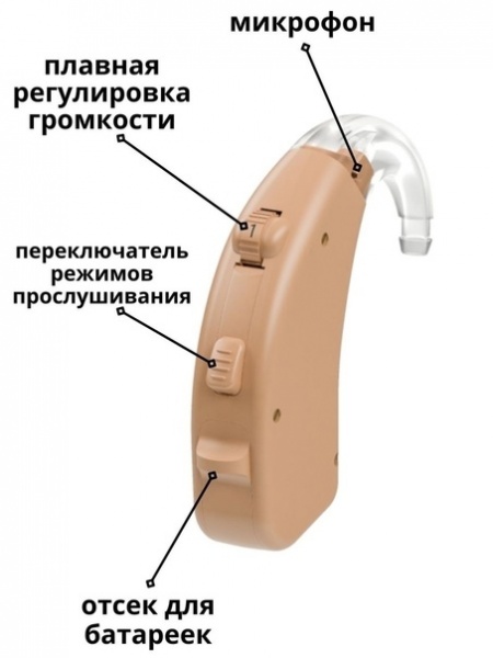 Регулятор громкости, кнопочный переключатель режимов прослушивания, включение/выключение аппарата с помощью батарейного отсека.