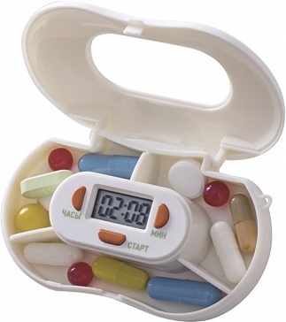 Содержит 3 отделения для различных видов лекарственных средств или витаминов. Встроенный таймер поможет вовремя принять лекарство: нужно установить время, которое осталось ДО приема лекарственных средств или витаминов, по истечении которого звуковой сигнал напомнит о том, что пора принимать лекарство.