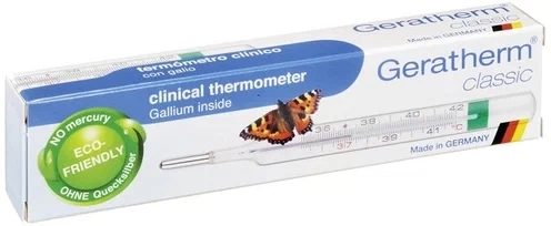 Градусник Geratherm Classic - классический термометр БЕЗ РТУТИ! Это единственный в мире термометр, который разработан по уникальной технологии «Geratherm Medical AG » с использованием безопасного жидкого металла — ГАЛИНСТАНА® вместо ртути. ГАЛИНСТАН® - единственный в мире заменитель ртути - сплав Галлия, Индия и Олова. Он нетоксичен и безопасен для человека. Термометры Geratherm Classic соответствуют требованиям Европейских норм и стандартов и гарантированно безопасны при использовании. Новые приборы изготовлены из закаленного стекла повышенной прочности.