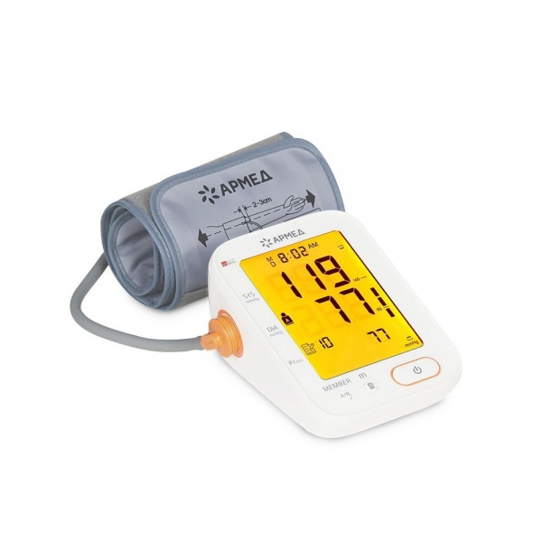 Тонометр оснащен манжетой, измеряющей давление по всей окружности плеча без привязки к сгибу локтя. Подходит для размеров 22-45 см.