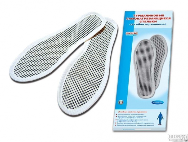 Оздоровительный эффект от применения стелек достигается за счет воздействия ткани, содержащей кристаллы турмалина диаметром 3мм, и основы из вспененного каучукового латекса.