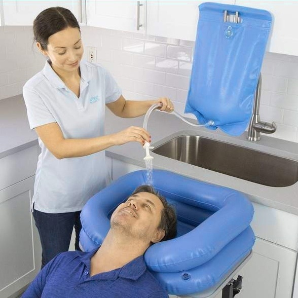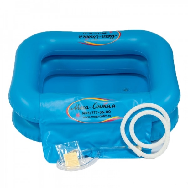 Ванночка надувная позволяет мыть голову больным с ограниченной подвижностью и постельным режимом. Устанавливается на постель под голову больного; позволяет зафиксировать голову в удобном положении благодаря выемке на передней части ванны.