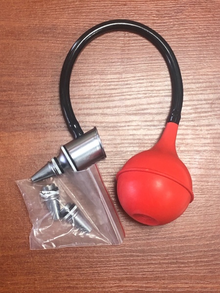 Устройство снабжено увеличительным стеклом для осмотра и пневматической грушей для создания давления в ухе, имеются 3 ушные воронки различных размеров.