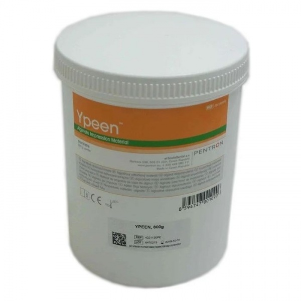 Альгинатная оттискная масса широко применяется как в стоматологической практике, так и в ортодонтии. При помощи материала могут быть изготовлены частичные съемные протезы, временные коронки, мостовидные протезы, предварительные оттиски (для изготовления полных съемных протезов), индивидуальные оттискные ложки, а также ортодонтические рабочие модели. Масса YPEEN проста в замешивании, характеризуется оптимальными показателями вязкости и быстротой отверждения. Материал очень точно передает даже мелкие детали оттиска. Рабочие характеристики: оптимальный период работы (замешивание в течении полуминуты, обработка в течение двух минут, отверждение в течение 2 минут 30 секунд включая этап смешивания). После снятия, оттиск необходимо залить гипсом и хранить в среде со 100 %-ой влажностью не более 4-х часов. Страна-производитель: Чехия.