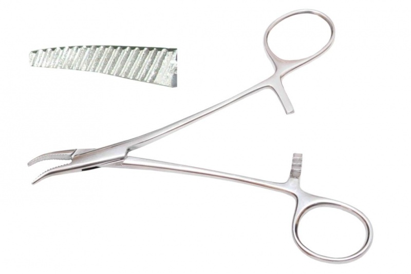 Зажим кровоостанавливающий нейрохирургический изогнутый — инструмент для остановки кровотечения из сосудов головного и спинного мозга, а также для фиксации твердой мозговой оболочки.